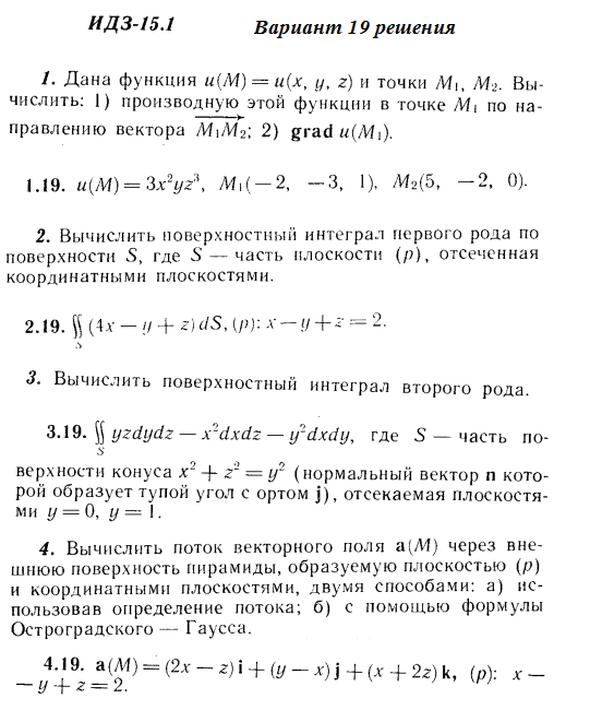 Решения 4-х заданий на поверхностные интегралы из Рябушко части 3 ИДЗ 15.1 вариант 19