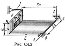 Две однородные прямоугольные тонкие плиты жестко соединены (сварены) под прямым углом друг к другу и закреплены сферическим шарниром (или подпятником) в точке А, цилиндрическим шарниром (подшипником) в точке В и невесомым стержнем 1 (рис. С4.0 — С4.7) или же двумя подшипниками в точках A и В и двумя невесомыми стержнями 1 и 2 (рис. С4.8, С4.9); все стержни прикреплены к плитам и к неподвижным опорам шарнирами. Размеры плит указаны на рисунках; вес большей плиты P1 = 5 кН, вес меньшей плиты P2 = 3 кН. Каждая из плит расположена параллельно одной из координатных плоскостей (плоскость ху — горизонтальная). На плиты действуют пара сил с моментом М = 4 кН·м, лежащая в плоскости одной из плит, и две силы. Значения этих сил, их направления и точки приложения указаны в табл. С4; при этом силы F1 и F4 лежат в плоскостях, параллельных плоскости ху, сила F2 — в плоскости, параллельной xz, и сила F3 — в плоскости, параллельной yz. Точки приложения сил (D, Е, Н, К) находятся в углах или в серединах сторон плит. Определить реакции связей в точках А и В и реакцию стержня (стержней). При подсчетах принять а = 0,6 м.