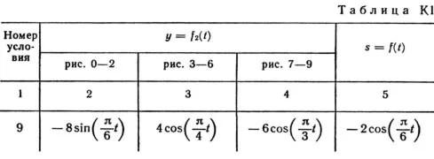 Под номером К1 помещены две задачи К1а и К1б, которые надо решить. Задача К1а. Точка В движется в плоскости xy (рис. К1.0 — К 1.9, табл. К1; траектория точки на рисунках показана условно). Закон движения точки задан уравнениями: x = f1(t), y = f2(t), где x и y выражены в сантиметрах, t — в секундах. Найти уравнение траектории точки; для момента времени t1 = 1 с определить скорость и ускорение точки, а также ее касательное и нормальное ускорения и радиус кривизны в соответствующей точке траектории. Зависимость x = f1(t) указана непосредственно на рисунках, а зависимость y = f2(t) дана в табл. K1 (для рис. 0—2 в столбце 2, для рис. 3—6 в столбце 3, для рис. 7—9 в столбце 4). Как и в задачах С1 — С4, номер рисунка выбирается по предпоследней цифре шифра, а номер условия в табл. К1 — по последней. Задача К1б. Точка движется по дуге окружности радиуса R = 2 м по закону s = f(t), заданному в табл. К1 в столбце 5 (s — в метрах, t — в секундах), где s =AM — расстояние точки от некоторого начала A, измеренное вдоль дуги окружности. Определить скорость и ускорение точки в момент времени t1 = 1 с. Изобразить на рисунке векторы v и a, считая, что точка в этот момент находится в положении M, а положительное направление отсчета s — от А к М.
