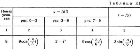 Под номером К1 помещены две задачи К1а и К1б, которые надо решить. Задача К1а. Точка В движется в плоскости xy (рис. К1.0 — К 1.9, табл. К1; траектория точки на рисунках показана условно). Закон движения точки задан уравнениями: x = f1(t), y = f2(t), где x и y выражены в сантиметрах, t — в секундах. Найти уравнение траектории точки; для момента времени t1 = 1 с определить скорость и ускорение точки, а также ее касательное и нормальное ускорения и радиус кривизны в соответствующей точке траектории. Зависимость x = f1(t) указана непосредственно на рисунках, а зависимость y = f2(t) дана в табл. K1 (для рис. 0—2 в столбце 2, для рис. 3—6 в столбце 3, для рис. 7—9 в столбце 4). Как и в задачах С1 — С4, номер рисунка выбирается по предпоследней цифре шифра, а номер условия в табл. К1 — по последней. Задача К1б. Точка движется по дуге окружности радиуса R = 2 м по закону s = f(t), заданному в табл. К1 в столбце 5 (s — в метрах, t — в секундах), где s =AM — расстояние точки от некоторого начала A, измеренное вдоль дуги окружности. Определить скорость и ускорение точки в момент времени t1 = 1 с. Изобразить на рисунке векторы v и a, считая, что точка в этот момент находится в положении M, а положительное направление отсчета s — от А к М.