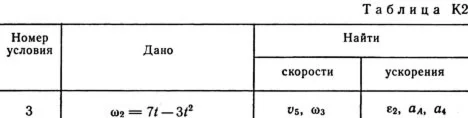 Механизм состоит из ступенчатых колес 1—3, находящихся в зацеплении или связанных ременной передачей, зубчатой рейки 4 и груза 5, привязанного к концу нити, намотанной на одно из колес (рис. К2.0 — К2.9, табл. К2). Радиусы ступеней колес равны соответственно: у колеса 1 – r1 = 2 см, R1 = 4 см, у колеса 2 – r2 = 6 см, R2 = 8 см, у колеса 3 – r3 — 12 см, R3 = 16 см. На ободьях колес расположены точки A, В и С. В столбце «Дано» таблицы указан закон движения или закон изменения скорости ведущего звена механизма, где φ1(t) — закон вращения колеса 1, s2(f) — закон движения рейки 4, ω2(t) — закон изменения угловой скорости колеса 2, v5(t) — закон изменения скорости груза 5 и т. д. (везде φ выражено в радианах, s — в сантиметрах, t — в секундах). Положительное направление для φ и ω против хода часовой стрелки, для s4, s5 и v4, v5 — вниз. Определить в момент времени t1 = 2 с указанные в таблице в столбцах «Найти» скорости (v — линейные, ω — угловые) и ускорения (а — линейные, ε — угловые) соответствующих точек или тел (v5 — скорость груза 5 и т. д.).