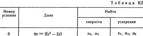Механизм состоит из ступенчатых колес 1—3, находящихся в зацеплении или связанных ременной передачей, зубчатой рейки 4 и груза 5, привязанного к концу нити, намотанной на одно из колес (рис. К2.0 — К2.9, табл. К2). Радиусы ступеней колес равны соответственно: у колеса 1 – r1 = 2 см, R1 = 4 см, у колеса 2 – r2 = 6 см, R2 = 8 см, у колеса 3 – r3 — 12 см, R3 = 16 см. На ободьях колес расположены точки A, В и С. В столбце «Дано» таблицы указан закон движения или закон изменения скорости ведущего звена механизма, где φ1(t) — закон вращения колеса 1, s2(f) — закон движения рейки 4, ω2(t) — закон изменения угловой скорости колеса 2, v5(t) — закон изменения скорости груза 5 и т. д. (везде φ выражено в радианах, s — в сантиметрах, t — в секундах). Положительное направление для φ и ω против хода часовой стрелки, для s4, s5 и v4, v5 — вниз. Определить в момент времени t1 = 2 с указанные в таблице в столбцах «Найти» скорости (v — линейные, ω — угловые) и ускорения (а — линейные, ε — угловые) соответствующих точек или тел (v5 — скорость груза 5 и т. д.).
