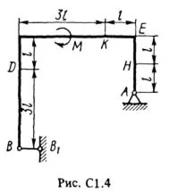 Жесткая рама, расположенная в вертикальной плоскости (рис. С1.0 — С1.9, табл. С1), закреплена в точке А шарнирно, а в точке В прикреплена или к невесомому стержню ВВ1, или к шарнирной опоре на катках; стержень прикреплен к раме и к неподвижной опоре шарнирами. На раму действуют пара сил с моментом М = 100 кН·м и две силы, значения, направления и точки приложения которых указаны в таблице (например, в условиях № 1 на раму действует сила F1 = 10 Н под углом 30° к горизонтальной оси, приложенная в точке K и сила F4 = 40 Н под углом 60° к горизонтальной оси, приложенная в точке H, и т. д.). Определить реакции связей в точках A, В, вызываемые заданными нагрузками. При окончательных расчетах принять l = 0,5 м.