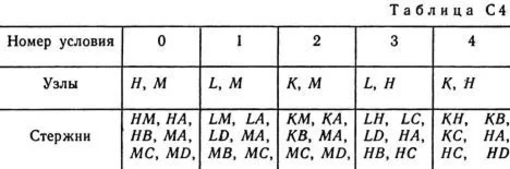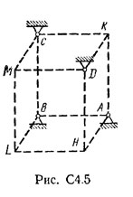 Шесть невесомых стержней соединены своими концами шарнирно друг с другом в двух узлах и прикреплены другими концами (тоже шарнирно) к неподвижным опорам А, В, С, D (рис. С4.0 — С4.9, табл. С4). Стержни и узлы (узлы расположены в вершинах H, К, L или М прямоугольного параллелепипеда) на рисунках не показаны и должны быть изображены решающим задачу по данным таблицы. В узле, который в каждом столбце таблицы указан первым, приложена сила Р = 200 Н; во втором узле приложена сила Q = 100 Н. Сила Р образует с положительными направлениями координатных осей х, у, z углы, равные соответственно α1 = 45°, β1 = 60°, γ1 = 60°, а сила Q — углы α2 = 60°, β2 = 45°, γ2 = 60°; направления осей х, у, z для всех рисунков показаны на рис. С4.0.
