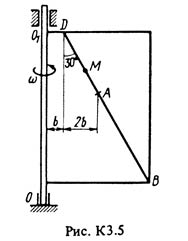 Прямоугольная пластина (рис. К3.0-К3.5) или круглая пластина радиусом R = 60 см (рис. К3.6-К3.9) вращается вокруг неподвижной оси с постоянной угловой скоростью ω, заданной в табл. К3 (при знаке минус направление ω противоположно показанному на рисунке). Ось вращения на рис. К3.0-К3.3 и К3.8, К3.9 перпендикулярна плоскости пластины и проходит через точку О (пластина вращается в своей плоскости); на рис. К3.4-К3.7 ось вращения ОО1 лежит в плоскости пластины (пластина вращается в пространстве). По пластине вдоль прямой BD (рис. К3.0-К3.5) или по окружности радиуса R, т. е. по ободу пластины (рис. К3.6-К3.9), движется точка М. Закон ее относительного движения, выражаемый уравнением s = AM = f(t) (s – в сантиметрах, t – в секундах), задан в табл. К3 отдельно для рис. К3.0-К3.5 и для рис. К3.6-К3.9,при этом на рис. 6-9 s = AM и отсчитывается по дуге окружности; там же даны размеры b и l. На всех рисунках точка М показаны в положении, при котором s = AM > 0 (при s < 0 точка М находится по другую сторону от точки A). Определить абсолютную скорость и абсолютное ускорение точки М в момент времени t1 = 1 с.
