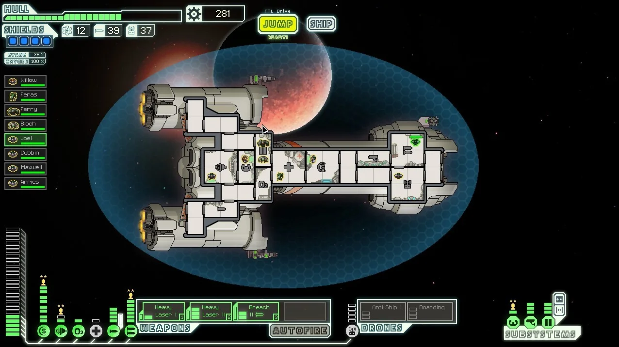 В FTL вам предстоит окунуться в атмосферу спасения галактики на своем космическом корабле. Это опасная миссия, в которой каждое столкновение представляет собой уникальную задачу с несколькими вариантами решения. Что вы будете делать, если шквал тяжелых ракет пробьет ваши щиты? Перенаправите всю энергию к двигателям в попытке сбежать, добавите мощности орудиям, чтобы расщепить врага на атомы, или смело возьмете врага на абордаж? Этот «двумерный симулятор космического корабля» позволит вам отправиться с вашим кораблем и экипажем на приключение через случайным образом генерируемую галактику, полную славы и горьких поражений.