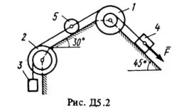 Механическая система состоит из ступенчатых шкивов 1 и2 весом P1 и P2 с радиусами ступеней R1 = R, r1 = 0,4R; R2 = R, r3 = 0,8R (массу каждого шкива считать равномерно распределенной по его внешнему ободу); грузов 3, 4 и сплошного однородного цилиндрического катка 5 весом P3, P4, P5 соответственно (рис. Д5.0-Д5.9 табл. Д5). Тела системы соединены нитями, намотанными на шкивы; участки нитей параллельны соответствующим плоскостям. Грузы Скользят по плоскостям без трения, а катки катяться без скольжения. Кроме сил тяжести на одно из тел системы действует постоянная сила F, а на шкивы 1 и 2 при их вращении действуют постоянные моменты сил сопротивления, равные соответственно M1 и M2. Составить для данной системы уравнение Лагранжа и определить из него величину, указанную в таблице в столбце «Найти», где обозначено: ε1, ε2 – угловые ускорения шкивов 1 и 2; а3, а4, аС5 – ускорения грузов 3, 4 и центра масс катка 5 соответственно. Когда в задаче надо определить ε1, ε2, считать R = 0,25 м. Тот из грузов 3, 4 вес которого равен нулю, на чертеже не изображать. Шкивы 1 и 2 всегда входят в систему.