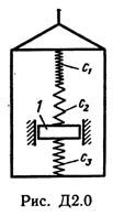 Груз 1 массой m укреплен на пружинной подвеске в лифте (рис. Д2.0 — Д2.9, табл. Д2). Лифт движется вертикально по закону z = 0,5α1t2 + α2sin(ωt) + α3cos(ωt) (ось z направлена по вертикали вверх; z выражено в метрах, t — в секундах). На груз действует сила сопротивления среды R = μv, где v — скорость груза по отношению к лифту. Найти закон движения груза по отношению к лифту, т. е. х = f(t); начало координат поместить в точке, где находится прикрепленный к грузу конец пружины, когда пружина не деформирована. При этом во избежание ошибок в знаках направить ось х в сторону удлинения пружины, а груз изобразить в положении, при котором х>0, т.е. пружина растянута. При подсчетах можно принять g = 10 м/с2. Массой пружин и соединительной планки 2 пренебречь. В таблице обозначено: c1, с2, c3 — коэффициенты жесткости пружин, λ0 — удлинение пружины с эквивалентной жесткостью в начальный момент времени t = 0, v0 — начальная скорость груза по отношению к лифту (направлена вертикально вверх). Прочерк в столбцах c1, с2, c3 означает, что соответствующая пружина отсутствует и на чертеже изображаться не должна. Если при этом конец одной из оставшихся пружин окажется свободным, его следует прикрепить в соответствующем месте или к грузу или к потолку (полу) лифта; то же следует сделать, если свободными окажутся соединенные планкой 2 концы обеих оставшихся пружин. Условие μ = 0 означает, что сила сопротивления R отсутствует.