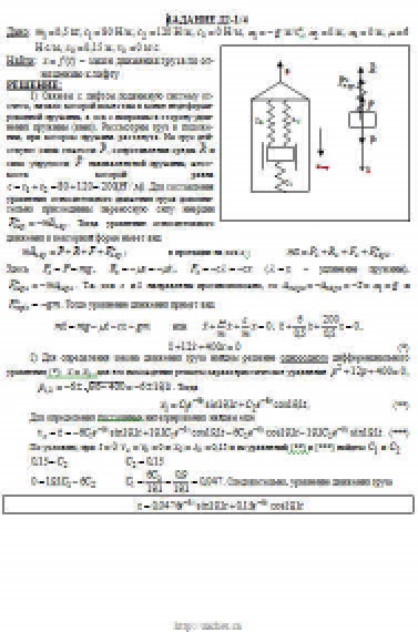Груз 1 массой m укреплен на пружинной подвеске в лифте (рис. Д2.0 — Д2.9, табл. Д2). Лифт движется вертикально по закону z = 0,5α1t2 + α2sin(ωt) + α3cos(ωt) (ось z направлена по вертикали вверх; z выражено в метрах, t — в секундах). На груз действует сила сопротивления среды R = μv, где v — скорость груза по отношению к лифту. Найти закон движения груза по отношению к лифту, т. е. х = f(t); начало координат поместить в точке, где находится прикрепленный к грузу конец пружины, когда пружина не деформирована. При этом во избежание ошибок в знаках направить ось х в сторону удлинения пружины, а груз изобразить в положении, при котором х>0, т.е. пружина растянута. При подсчетах можно принять g = 10 м/с2. Массой пружин и соединительной планки 2 пренебречь. В таблице обозначено: c1, с2, c3 — коэффициенты жесткости пружин, λ0 — удлинение пружины с эквивалентной жесткостью в начальный момент времени t = 0, v0 — начальная скорость груза по отношению к лифту (направлена вертикально вверх). Прочерк в столбцах c1, с2, c3 означает, что соответствующая пружина отсутствует и на чертеже изображаться не должна. Если при этом конец одной из оставшихся пружин окажется свободным, его следует прикрепить в соответствующем месте или к грузу или к потолку (полу) лифта; то же следует сделать, если свободными окажутся соединенные планкой 2 концы обеих оставшихся пружин. Условие μ = 0 означает, что сила сопротивления R отсутствует.