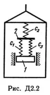 Груз 1 массой m укреплен на пружинной подвеске в лифте (рис. Д2.0 — Д2.9, табл. Д2). Лифт движется вертикально по закону z = 0,5α1t2 + α2sin(ωt) + α3cos(ωt) (ось z направлена по вертикали вверх; z выражено в метрах, t — в секундах). На груз действует сила сопротивления среды R = μv, где v — скорость груза по отношению к лифту. Найти закон движения груза по отношению к лифту, т. е. х = f(t); начало координат поместить в точке, где находится прикрепленный к грузу конец пружины, когда пружина не деформирована. При этом во избежание ошибок в знаках направить ось х в сторону удлинения пружины, а груз изобразить в положении, при котором х>0, т.е. пружина растянута. При подсчетах можно принять g = 10 м/с2. Массой пружин и соединительной планки 2 пренебречь. В таблице обозначено: c1, с2, c3 — коэффициенты жесткости пружин, λ0 — удлинение пружины с эквивалентной жесткостью в начальный момент времени t = 0, v0 — начальная скорость груза по отношению к лифту (направлена вертикально вверх). Прочерк в столбцах c1, с2, c3 означает, что соответствующая пружина отсутствует и на чертеже изображаться не должна. Если при этом конец одной из оставшихся пружин окажется свободным, его следует прикрепить в соответствующем месте или к грузу или к потолку (полу) лифта; то же следует сделать, если свободными окажутся соединенные планкой 2 концы обеих оставшихся пружин. Условие μ = 0 означает, что сила сопротивления R отсутствует.