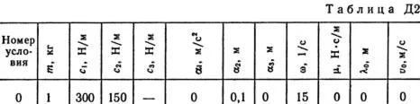 Груз 1 массой m укреплен на пружинной подвеске в лифте (рис. Д2.0 — Д2.9, табл. Д2). Лифт движется вертикально по закону z = 0,5α1t2 + α2sin(ωt) + α3cos(ωt) (ось z направлена по вертикали вверх; z выражено в метрах, t — в секундах). На груз действует сила сопротивления среды R = μv, где v — скорость груза по отношению к лифту. Найти закон движения груза по отношению к лифту, т. е. х = f(t); начало координат поместить в точке, где находится прикрепленный к грузу конец пружины, когда пружина не деформирована. При этом во избежание ошибок в знаках направить ось х в сторону удлинения пружины, а груз изобразить в положении, при котором х>0, т.е. пружина растянута. При подсчетах можно принять g = 10 м/с2. Массой пружин и соединительной планки 2 пренебречь. В таблице обозначено: c1, с2, c3 — коэффициенты жесткости пружин, λ0 — удлинение пружины с эквивалентной жесткостью в начальный момент времени t = 0, v0 — начальная скорость груза по отношению к лифту (направлена вертикально вверх). Прочерк в столбцах c1, с2, c3 означает, что соответствующая пружина отсутствует и на чертеже изображаться не должна. Если при этом конец одной из оставшихся пружин окажется свободным, его следует прикрепить в соответствующем месте или к грузу или к потолку (полу) лифта; то же следует сделать, если свободными окажутся соединенные планкой 2 концы обеих оставшихся пружин. Условие μ = 0 означает, что сила сопротивления R отсутствует.