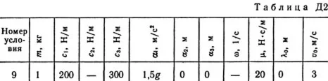 Груз 1 массой m укреплен на пружинной подвеске в лифте (рис. Д2.0 — Д2.9, табл. Д2). Лифт движется вертикально по закону z = 0,5α1t2 + α2sin(ωt) + α3cos(ωt) (ось z направлена по вертикали вверх; z выражено в метрах, t — в секундах). На груз действует сила сопротивления среды R = μv, где v — скорость груза по отношению к лифту. Найти закон движения груза по отношению к лифту, т. е. х = f(t); начало координат поместить в точке, где находится прикрепленный к грузу конец пружины, когда пружина не деформирована. При этом во избежание ошибок в знаках направить ось х в сторону удлинения пружины, а груз изобразить в положении, при котором х>0, т.е. пружина растянута. При подсчетах можно принять g = 10 м/с2. Массой пружин и соединительной планки 2 пренебречь. В таблице обозначено: c1, с2, c3 — коэффициенты жесткости пружин, λ0 — удлинение пружины с эквивалентной жесткостью в начальный момент времени t = 0, v0 — начальная скорость груза по отношению к лифту (направлена вертикально вверх). Прочерк в столбцах c1, с2, c3 означает, что соответствующая пружина отсутствует и на чертеже изображаться не должна. Если при этом конец одной из оставшихся пружин окажется свободным, его следует прикрепить в соответствующем месте или к грузу или к потолку (полу) лифта; то же следует сделать, если свободными окажутся соединенные планкой 2 концы обеих оставшихся пружин. Условие μ = 0 означает, что сила сопротивления R отсутствует.