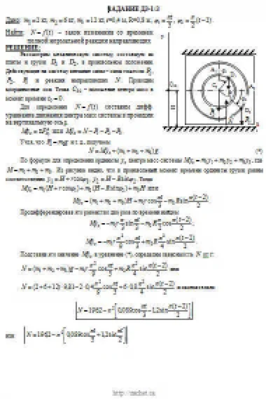 При движении грузов угол φ1 = ∠A2C3D1изменяется по закону φ1 = f1(t), а угол φ2 = ∠A2C3D2 — по закону φ2 = f2(t). В табл. ДЗ эти зависимости даны отдельно для рис. 0—4 и 5—9, где φ выражено в радианах, t — в секундах. Считая грузы материальными точками и пренебрегая всеми сопротивлениями, определить закон изменения со временем величины, указанной в таблице в столбце «Найти», т. е. x3 = t3(t) и N = f(t), где x3 — координата центра C3 плиты (зависимость x3 = f3(t) определяет закон движения плиты), N — полная нормальная реакция направляющих.