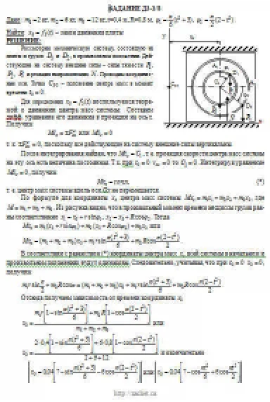 Механическая система состоит из грузов D1 массой m1 = 2 кг и D2 массой m2 = 6 кг и из прямоугольной вертикальной плиты массой m3 = 12 кг, движущейся вдоль горизонтальных направляющих (рис. Д3.0 — Д3.9, табл. Д3). В момент времени t0 = 0, когда система находилась в покое, под действием внутренних сил грузы начинают двигаться по желобам, представляющим собой окружности радиусов r = 0,4 м и R = 0,8 м.