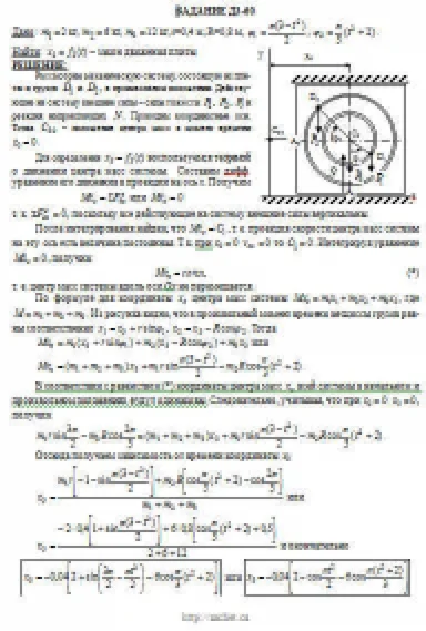 При движении грузов угол φ1 = ∠A2C3D1изменяется по закону φ1 = f1(t), а угол φ2 = ∠A2C3D2 — по закону φ2 = f2(t). В табл. ДЗ эти зависимости даны отдельно для рис. 0—4 и 5—9, где φ выражено в радианах, t — в секундах. Считая грузы материальными точками и пренебрегая всеми сопротивлениями, определить закон изменения со временем величины, указанной в таблице в столбце «Найти», т. е. x3 = t3(t) и N = f(t), где x3 — координата центра C3 плиты (зависимость x3 = f3(t) определяет закон движения плиты), N — полная нормальная реакция направляющих.