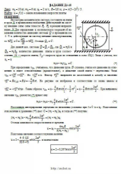 Механическая система состоит из прямоугольной вертикальной плиты 1 массой m1 = 18 кг, движущейся вдоль горизонтальных направляющих, и груза D массой m2 = 6 кг (рис. Д4.0 — Д4.9, табл. Д4). В момент времени t0 = 0, когда скорость плиты u0 = 2 м/с, груз под действием внутренних сил начинает двигаться по желобу плиты. На рис. 0—3 желоб КЕ прямолинейный и при движении груза расстояние s = AD изменяется по закону s = f1(t), а на рис. 4—9 желоб — окружность радиуса R = 0,8 м и при движении груза угол φ = ∟AC1D изменяется по закону ф = f2(t). В табл. Д4 эти зависимости даны отдельно для рис. 0 и 1, для рис. 2 и 3 и т. д., где s выражено в метрах, φ — в радианах» t — в секундах. Считая груз материальной точкой и пренебрегая всеми сопротивлениями, определить зависимость u = f(t), т. е. скорость плиты как функцию времени.