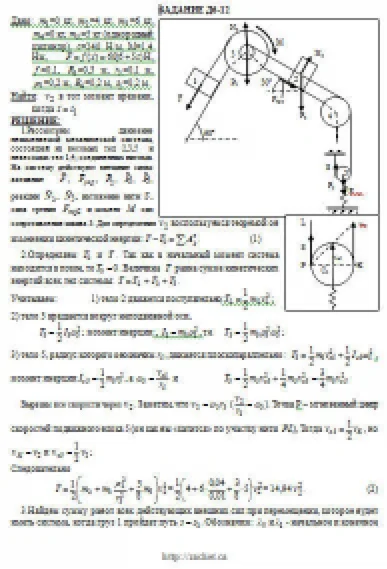Механическая система состоит из грузов 1 и 2, ступенчатого шкива 3 с радиусами ступеней R3 = 0,3 м, r3 = 0,1 м и радиусом инерции относительно оси вращения ρ3 = 0,2 м, блока 4 радиуса R4 = 0,2 м и катка (или подвижного блока) 5 (рис. Д6.0 — Д6.9, табл. Д6); тело 5 считать сплошным однородным цилиндром, а массу блока 4 — равномерно распределенной по ободу. Коэффициент трения грузов о плоскость f = 0,1. Тела системы соединены друг с другом нитями, перекинутыми через блоки и намотанными на шкив 3 (или на шкив и каток); участки нитей параллельны соответствующим плоскостям. К одному из тел прикреплена пружина с коэффициентом жесткости c. Под действием силы F = f(s), зависящей от перемещения s точки ее приложения, система приходит в движение из состояния покоя; деформация пружины в момент начала движения равна нулю. При движении на шкив 3 действует постоянный момент М сил сопротивления (от трения в подшипниках). Определить значение искомой величины в тот момент времени, когда перемещение s станет равным s1 = 0,2 м. Искомая величина указана в столбце «Найти» таблицы, где обозначено: v1, v2, vC5 — скорости грузов 1, 2 и центра масс тела 5 соответственно, ω3 и ω4 — угловые скорости тел 3 и 4. Все катки, включая и катки, обмотанные нитями (как, например, каток 5 на рис. 2), катятся по плоскостям без скольжения. На всех рисунках не изображать груз 2, если m2 = 0; остальные тела должны изображаться и тогда, когда их масса равна нулю.
