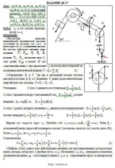Механическая система состоит из грузов 1 и 2, ступенчатого шкива 3 с радиусами ступеней R3 = 0,3 м, r3 = 0,1 м и радиусом инерции относительно оси вращения ρ3 = 0,2 м, блока 4 радиуса R4 = 0,2 м и катка (или подвижного блока) 5 (рис. Д6.0 — Д6.9, табл. Д6); тело 5 считать сплошным однородным цилиндром, а массу блока 4 — равномерно распределенной по ободу. Коэффициент трения грузов о плоскость f = 0,1. Тела системы соединены друг с другом нитями, перекинутыми через блоки и намотанными на шкив 3 (или на шкив и каток); участки нитей параллельны соответствующим плоскостям. К одному из тел прикреплена пружина с коэффициентом жесткости c. Под действием силы F = f(s), зависящей от перемещения s точки ее приложения, система приходит в движение из состояния покоя; деформация пружины в момент начала движения равна нулю. При движении на шкив 3 действует постоянный момент М сил сопротивления (от трения в подшипниках). Определить значение искомой величины в тот момент времени, когда перемещение s станет равным s1 = 0,2 м. Искомая величина указана в столбце «Найти» таблицы, где обозначено: v1, v2, vC5 — скорости грузов 1, 2 и центра масс тела 5 соответственно, ω3 и ω4 — угловые скорости тел 3 и 4. Все катки, включая и катки, обмотанные нитями (как, например, каток 5 на рис. 2), катятся по плоскостям без скольжения. На всех рисунках не изображать груз 2, если m2 = 0; остальные тела должны изображаться и тогда, когда их масса равна нулю.