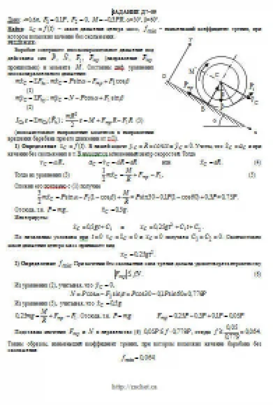 Барабан радиуса R весом P имеет выточку (как у катушки) радиуса r = 0,6R (рис. Д7.0 — Д7.9, табл. Д7). К концам намотанных на барабан нитей приложены постоянные силы F1 и F2, направления которых определяются углом β; кроме сил на барабан действует пара с моментом М; когда в таблице М<0, направление момента противоположно показанному на рисунке. При движении, начинающемся из состояния покоя, барабан катится без скольжения по шероховатой наклонной плоскости с углом наклона α так, как показано на рисунках. Пренебрегая сопротивлением качению, определить закон движения центра масс С барабана, т. е. xC = f(t), и наименьшее значение коэффициента трения f о плоскость, при котором возможно качение без скольжения. Барабан рассматривать как сплошной однородный цилиндр радиуса R.