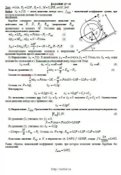 Барабан радиуса R весом P имеет выточку (как у катушки) радиуса r = 0,6R (рис. Д7.0 — Д7.9, табл. Д7). К концам намотанных на барабан нитей приложены постоянные силы F1 и F2, направления которых определяются углом β; кроме сил на барабан действует пара с моментом М; когда в таблице М<0, направление момента противоположно показанному на рисунке. При движении, начинающемся из состояния покоя, барабан катится без скольжения по шероховатой наклонной плоскости с углом наклона α так, как показано на рисунках. Пренебрегая сопротивлением качению, определить закон движения центра масс С барабана, т. е. xC = f(t), и наименьшее значение коэффициента трения f о плоскость, при котором возможно качение без скольжения. Барабан рассматривать как сплошной однородный цилиндр радиуса R.
