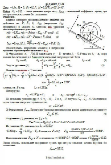 Барабан радиуса R весом P имеет выточку (как у катушки) радиуса r = 0,6R (рис. Д7.0 — Д7.9, табл. Д7). К концам намотанных на барабан нитей приложены постоянные силы F1 и F2, направления которых определяются углом β; кроме сил на барабан действует пара с моментом М; когда в таблице М<0, направление момента противоположно показанному на рисунке. При движении, начинающемся из состояния покоя, барабан катится без скольжения по шероховатой наклонной плоскости с углом наклона α так, как показано на рисунках. Пренебрегая сопротивлением качению, определить закон движения центра масс С барабана, т. е. xC = f(t), и наименьшее значение коэффициента трения f о плоскость, при котором возможно качение без скольжения. Барабан рассматривать как сплошной однородный цилиндр радиуса R.