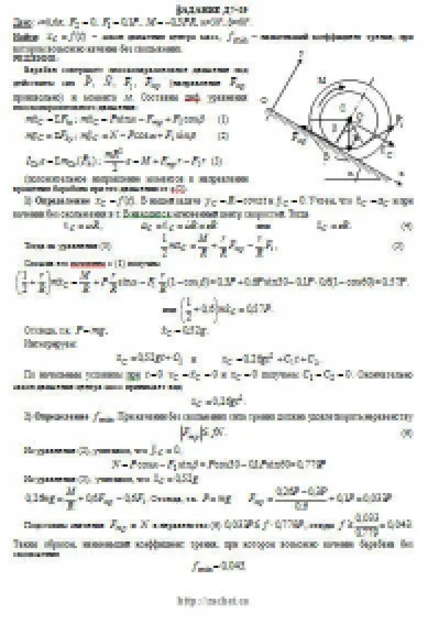 Барабан радиуса R весом P имеет выточку (как у катушки) радиуса r = 0,6R (рис. Д7.0 — Д7.9, табл. Д7). К концам намотанных на барабан нитей приложены постоянные силы F1 и F2, направления которых определяются углом β; кроме сил на барабан действует пара с моментом М; когда в таблице М<0, направление момента противоположно показанному на рисунке. При движении, начинающемся из состояния покоя, барабан катится без скольжения по шероховатой наклонной плоскости с углом наклона α так, как показано на рисунках. Пренебрегая сопротивлением качению, определить закон движения центра масс С барабана, т. е. xC = f(t), и наименьшее значение коэффициента трения f о плоскость, при котором возможно качение без скольжения. Барабан рассматривать как сплошной однородный цилиндр радиуса R.