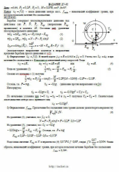 Барабан радиуса R весом P имеет выточку (как у катушки) радиуса r = 0,6R (рис. Д7.0 — Д7.9, табл. Д7). К концам намотанных на барабан нитей приложены постоянные силы F1 и F2, направления которых определяются углом β; кроме сил на барабан действует пара с моментом М; когда в таблице М<0, направление момента противоположно показанному на рисунке. При движении, начинающемся из состояния покоя, барабан катится без скольжения по шероховатой наклонной плоскости с углом наклона α так, как показано на рисунках. Пренебрегая сопротивлением качению, определить закон движения центра масс С барабана, т. е. xC = f(t), и наименьшее значение коэффициента трения f о плоскость, при котором возможно качение без скольжения. Барабан рассматривать как сплошной однородный цилиндр радиуса R.