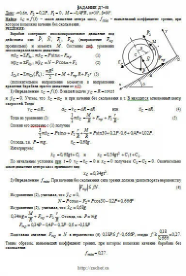 Барабан радиуса R весом P имеет выточку (как у катушки) радиуса r = 0,6R (рис. Д7.0 — Д7.9, табл. Д7). К концам намотанных на барабан нитей приложены постоянные силы F1 и F2, направления которых определяются углом β; кроме сил на барабан действует пара с моментом М; когда в таблице М<0, направление момента противоположно показанному на рисунке. При движении, начинающемся из состояния покоя, барабан катится без скольжения по шероховатой наклонной плоскости с углом наклона α так, как показано на рисунках. Пренебрегая сопротивлением качению, определить закон движения центра масс С барабана, т. е. xC = f(t), и наименьшее значение коэффициента трения f о плоскость, при котором возможно качение без скольжения. Барабан рассматривать как сплошной однородный цилиндр радиуса R.
