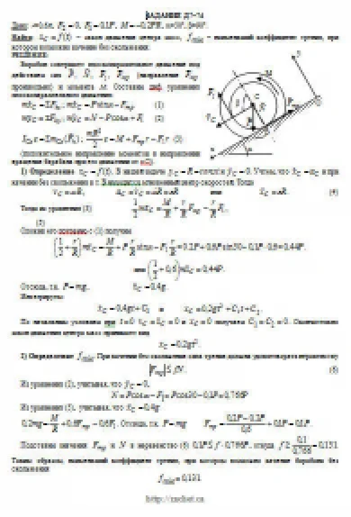 Барабан радиуса R весом P имеет выточку (как у катушки) радиуса r = 0,6R (рис. Д7.0 — Д7.9, табл. Д7). К концам намотанных на барабан нитей приложены постоянные силы F1 и F2, направления которых определяются углом β; кроме сил на барабан действует пара с моментом М; когда в таблице М<0, направление момента противоположно показанному на рисунке. При движении, начинающемся из состояния покоя, барабан катится без скольжения по шероховатой наклонной плоскости с углом наклона α так, как показано на рисунках. Пренебрегая сопротивлением качению, определить закон движения центра масс С барабана, т. е. xC = f(t), и наименьшее значение коэффициента трения f о плоскость, при котором возможно качение без скольжения. Барабан рассматривать как сплошной однородный цилиндр радиуса R.