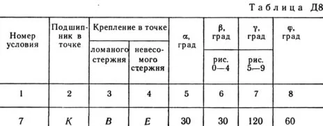 Вертикальный вал АК (рис. Д8.0 — Д8.9), вращающийся с постоянной угловой скоростью ω = 10 с-1, закреплен подпятником в точке A и цилиндрическим подшипником в точке, указанной в табл. Д8 в столбце 2 (АВ = BD = DE = ЕК = a). К валу жестко прикреплены тонкий однородный ломаный стержень массой m = 10 кг, состоящий из частей 1 и 2 (размеры частей стержня показаны на рисунках, где b = 0,1 м, а их массы m1 и m2 пропорциональны длинам), и невесомый стержень длиной l = 4b с точечной массой m3 = 3 кг на конце; оба стержня лежат в одной плоскости. Точки крепления стержней указаны в таблице в столбцах 3 и 4, а углы α, β, γ, φ даны в столбцах 5—8. Пренебрегая весом вала, определить реакции подпятника и подшипника. При подсчетах принять а = 0,6 м.
