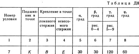 Вертикальный вал АК (рис. Д8.0 — Д8.9), вращающийся с постоянной угловой скоростью ω = 10 с-1, закреплен подпятником в точке A и цилиндрическим подшипником в точке, указанной в табл. Д8 в столбце 2 (АВ = BD = DE = ЕК = a). К валу жестко прикреплены тонкий однородный ломаный стержень массой m = 10 кг, состоящий из частей 1 и 2 (размеры частей стержня показаны на рисунках, где b = 0,1 м, а их массы m1 и m2 пропорциональны длинам), и невесомый стержень длиной l = 4b с точечной массой m3 = 3 кг на конце; оба стержня лежат в одной плоскости. Точки крепления стержней указаны в таблице в столбцах 3 и 4, а углы α, β, γ, φ даны в столбцах 5—8. Пренебрегая весом вала, определить реакции подпятника и подшипника. При подсчетах принять а = 0,6 м.