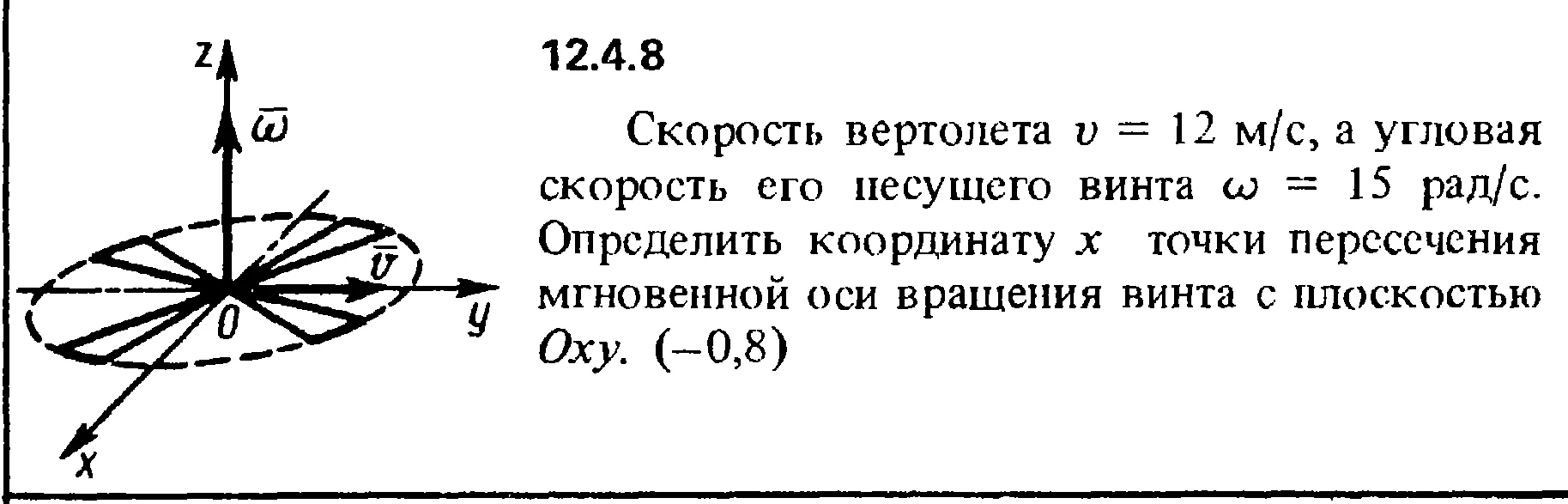 Скорость вертолета v = 12 м/с, а угловая скорость его несущего винта ω = 15 рад/с. Определить координату х точки пересечения мгновенной оси вращения винта с плоскостью Оху.
