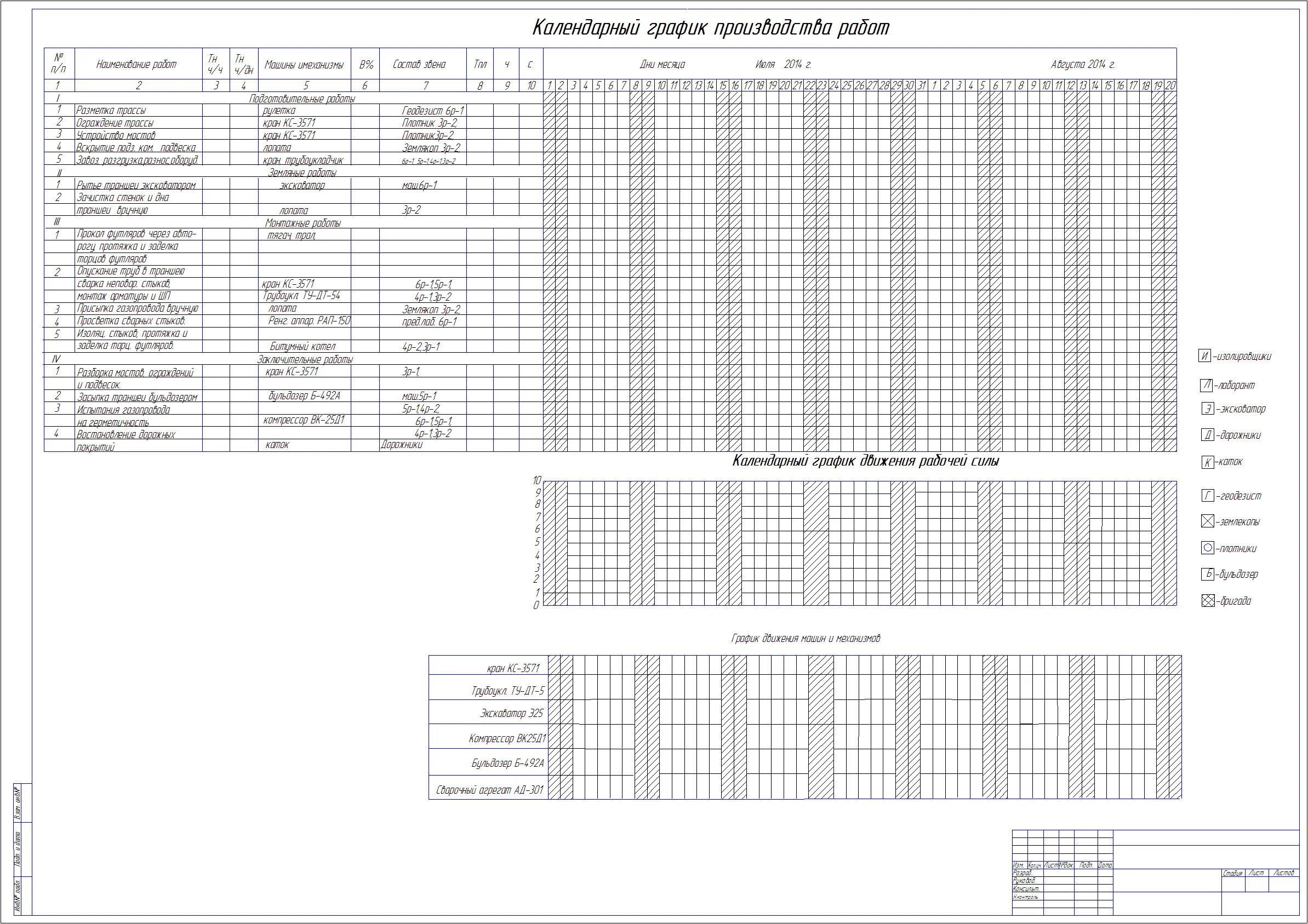 Чистый календарный график производства работ, календарный график движения рабочей силы, машин и механизмов на прокладку полиэтиленовых труб