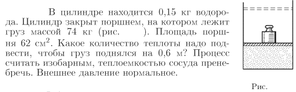 В цилиндре находится 0,15 кг водорода. Цилиндр закрыт поршнем, на котором лежит груз массой 74 кг (рис. 17.2). Площадь поршня 62 см2. Какое количество теплоты надо подвести, чтобы груз поднялся на 0,6 м? Процесс считать изобарным, теплоемкостью сосуда пренебречь. Внешнее давление нормальное.