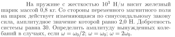 На пружине с жесткостью 103 Н/м висит железный шарик массой 0,8 кг. Со стороны переменного магнитного поля на шарик действует изменяющаяся по синусоидальному закону сила, амплитудное значение которой равно 2.0 Н. Добротность системы равна 30. Определить амплитуду вынужденных колебаний в случаях, если w=w0/2; w=w0; w=2wo-