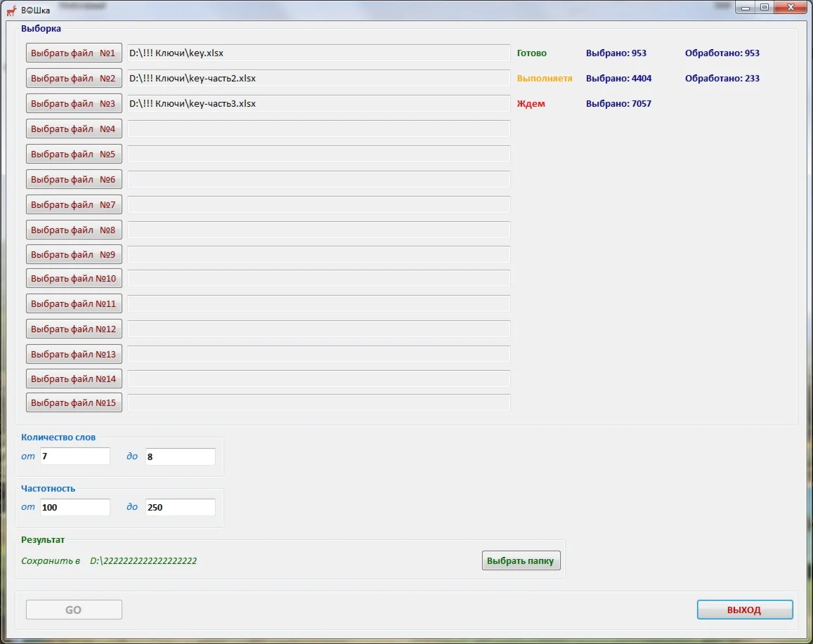 Программа берёт файл (до 15 файлов) экселя (xls, xlxs), в которых три колонки, первая - ключевое слово, вторая - количество ключевых слов, третья - частотность, и по заданным параметрам осуществляет выборку и записывает в файлы reslut.