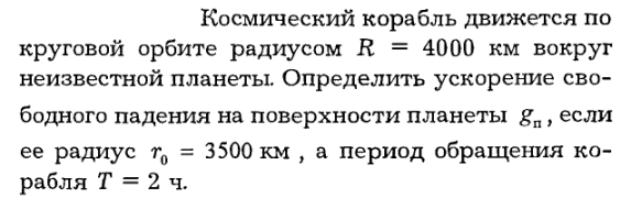 Космический корабль движется по круговой орбите радиусом R = 4000 км вокруг неизвестной планеты. Определить ускорение свободного падения на поверхности планеты gп, если ее радиус r0 = 3500 км , а период обращения корабля T = 2 ч.