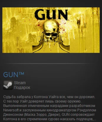 Gun - кинематографичный блокбастер от компании Activision. В этом увлекательном action'е с ролевыми элементами, выполненном в лучших традициях киновестернов, тебя ждут захватывающие приключения на Диком Западе - погони, перестрелки и зубодробительные потасовки. Оседлав своего верного коня, ты сможешь вихрем промчаться по пыльным прериям Америки, выследить своих врагов и накормить их свинцом. Докажи, что ты - не робкого десятка, и задай жару всем бандитам Нового Света!