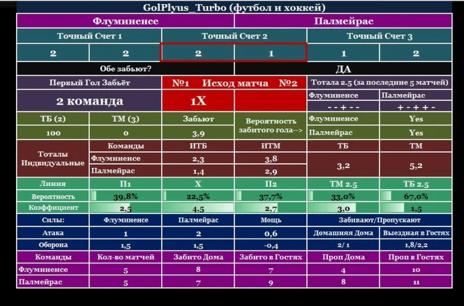 Программа «GolPlyus Turbo v.9 2016» специально создана для глубокого анализа на предстоящие футбольные и хоккейные события. Программа обладает хорошим коэффициентом проходимости т.к. использует очень качественные формулы для вычисления будущего исхода спортивного события. «GolPlyus Turbo v.9 2016» очень проста в использовании, программа не требует огромного копирования статистики матчей, а только последних пяти матчей дома, в гостях, и очных встреч. Это намного ускоряет аналитику матча, что очень хорошо подходит для LIVE режима, когда нужна быстрая аналитика матча, поэтому программа и называется «GolPlyus Turbo v.9 2016». За небольшой промежуток времени вы можете проанализировать большое количество матчей при этом потратив минимум время и усилий. Программа быстро вычисляет точный счет матча, сколько забьют голов команды, предстоящий исход матча и показывает рекомендуемую ставку на данное событие. С программой «GolPlyus Turbo v.9 2016» вы сможете значительно повысить свои шансы выиграть у букмекерской конторы большие суммы денег.