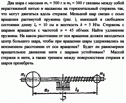 Два шара с массами m1 = 500 г и m2 = 300 г связаны между собой нерастяжимой нитью и насажены на горизонтальный стержень так, что могут двигаться вдоль стержня. Меньший шар связан с осью вращения растянутой пружины (рис. ), имеющей в свободном состоянии длину l0 = 10 см и жесткость k = 5 Н/м. Стержень с шарами вращается с частотой n = 45 об/мин. Найти удлинение пружины. На каком расстоянии от оси вращения должен находиться центр большего шара, чтобы при вращении шары удерживались на неизменном расстоянии от оси вращения? Будет ли равномерное вращательное движение нити с шарами устойчивым? Массой стержня и нити, а также трением между поверхностями стержня и шаров пренебречь.