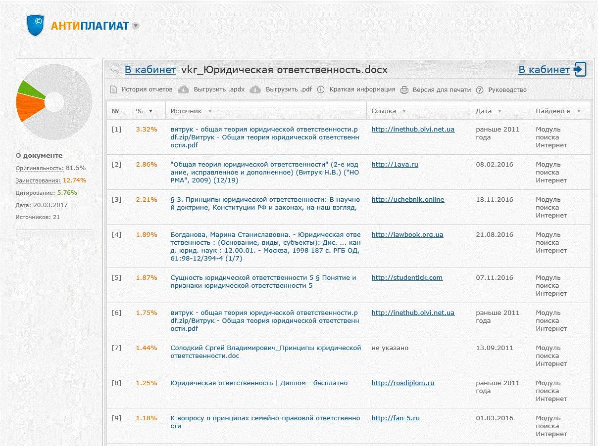 Готовая дипломная работа на тему: Юридическая ответственность выполнена в 2017 году, уникальность (антиплагиат) - 81%.