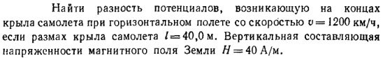 Найти разность потенциалов, возникающую на концах крыла самолета при горизонтальном полете со скоростью v = 1200 км/ч, если размах крыла самолета l = 40,0 м. Вертикальная составляющая напряженности магнитного поля Земли H = 40 А/м.