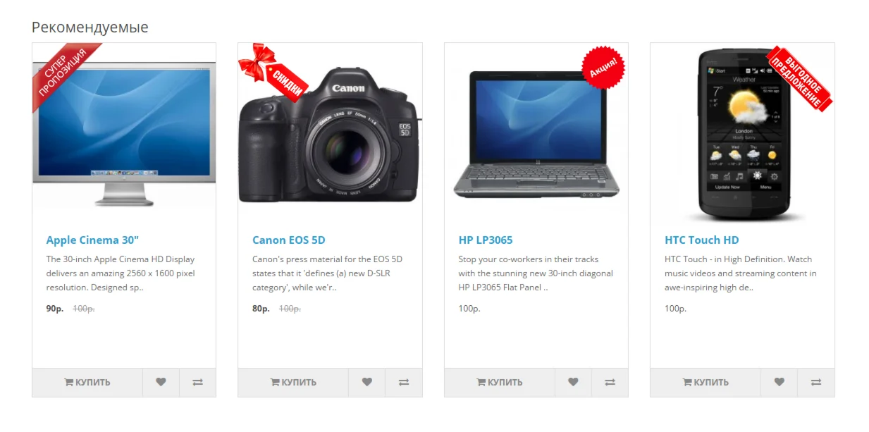 - в стандартных модулях: Рекомендуемые, Последние, Бестселлеры, Скидки