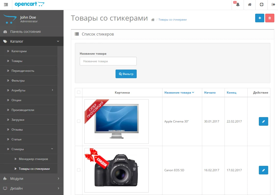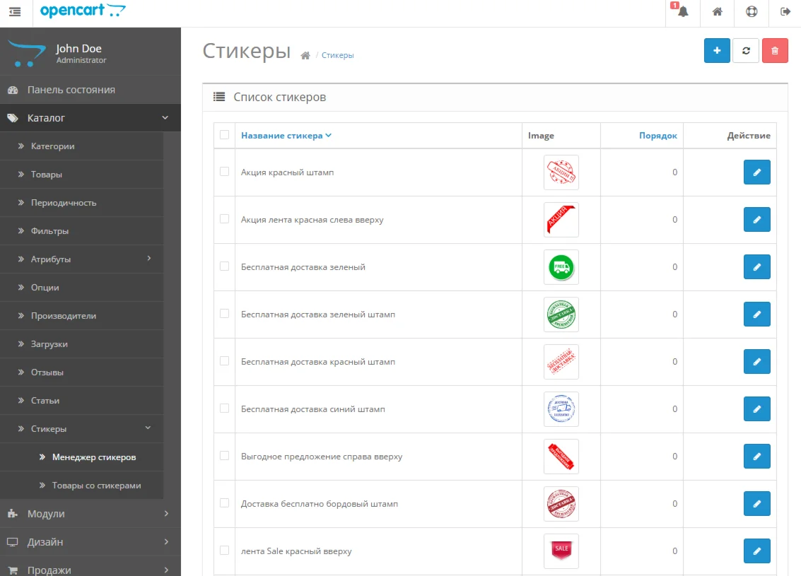 Магазин » Модуль Стикеры на товары для Opencart 2