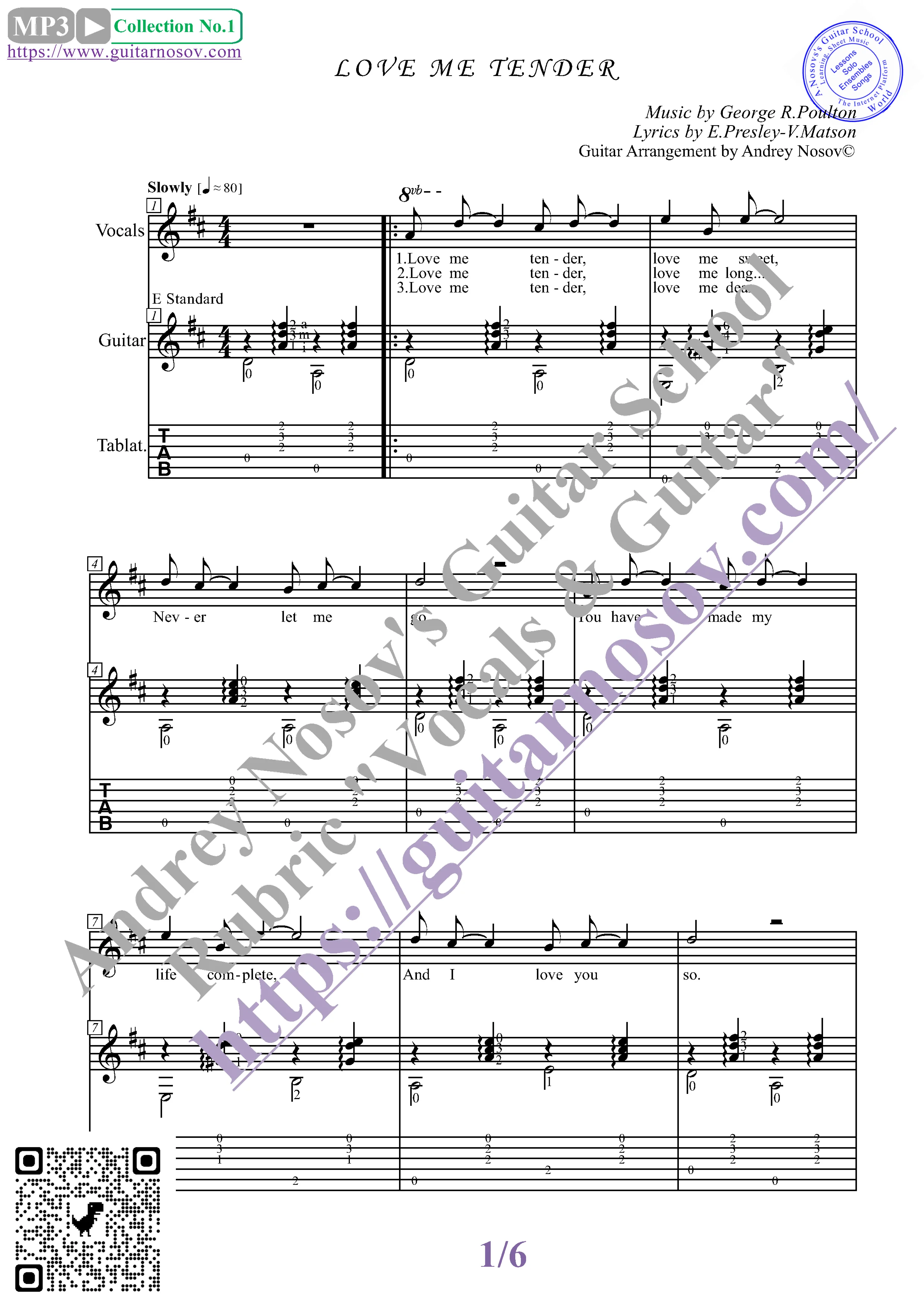 Вашему вниманию предлагается композиция "Love Me Tender (mus.G.R.Poulton, lir.E.Presley-V.Matson)", предназначенная для вокала в сопровождении 6-ти струнной гитары. Запись выполнена нотами и включает в себя партию вокала с подтекстовкой, партию гитары с подробнейшей аппликатурой и текст песни (НА АНГЛИЙСКОМ). Партия гитары продублирована табулатурой. Товар состоит из двух частей: 1 – Ноты с табулатурой; 2 – Ноты без табулатуры (в одном PDF). Прилагается ссылка на прослушивание / скачивание mp3.