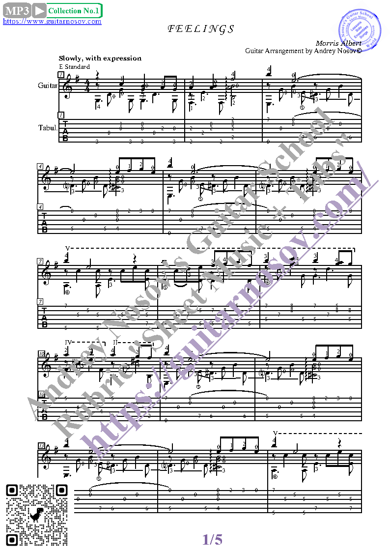 Вашему вниманию предлагается композиция "Feelings (M.Albert)", предназначенная для исполнения на 6-ти струнной гитаре СОЛО. Запись выполнена нотами, сопровождена подробнейшей аппликатурой и продублирована табулатурой. И ещё... Товар состоит из двух частей (pdf / png*): 1 – Ноты с табулатурой; 2 – Ноты без табулатуры. Прилагается ссылка на скачивание mp3.