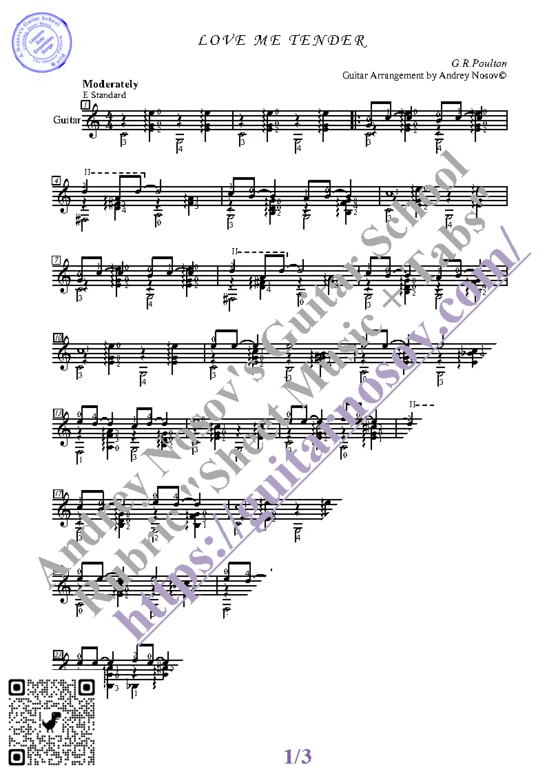 Вашему вниманию предлагается композиция "Love Me Tender (G.R.Poulton)", предназначенная для исполнения на 6-ти струнной гитаре СОЛО. Запись выполнена нотами, сопровождена подробнейшей аппликатурой и продублирована табулатурой. И ещё... Товар состоит из двух частей (pdf / png*): 1 – Ноты с табулатурой; 2 – Ноты без табулатуры. Прилагается ссылка на скачивание mp3.