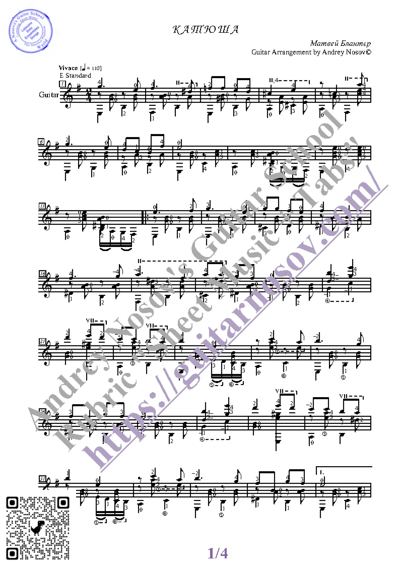 Вашему вниманию предлагается композиция "Катюша (М.Блантер)", предназначенная для исполнения на 6-ти струнной гитаре СОЛО. Запись выполнена нотами, сопровождена подробнейшей аппликатурой и продублирована табулатурой. И ещё... Товар состоит из двух частей (pdf / png*): 1 – Ноты с табулатурой; 2 – Ноты без табулатуры. Прилагается ссылка на скачивание mp3.