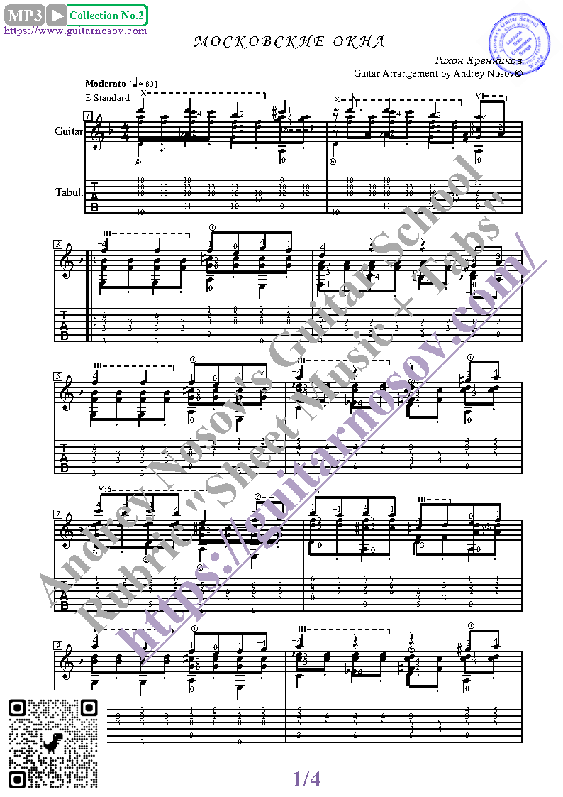 Вашему вниманию предлагается композиция "Московские окна (Т.Хренников)", предназначенная для исполнения на 6-ти струнной гитаре СОЛО. Запись выполнена нотами, сопровождена подробнейшей аппликатурой и продублирована табулатурой. И ещё... Товар состоит из двух частей (pdf / png*): 1 – Ноты с табулатурой; 2 – Ноты без табулатуры. Прилагается ссылка на скачивание mp3.
