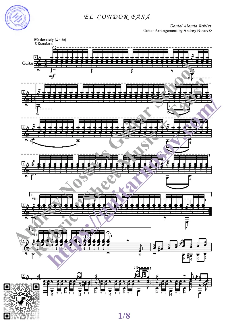 Вашему вниманию предлагается композиция "El Condor Pasa (D.A.Robles)", предназначенная для исполнения на 6-ти струнной гитаре СОЛО. Запись выполнена нотами, сопровождена подробнейшей аппликатурой и продублирована табулатурой. Товар состоит из двух частей (pdf / png*): 1 – Ноты с табулатурой; 2 – Ноты без табулатуры. Прилагается ссылка на скачивание mp3.